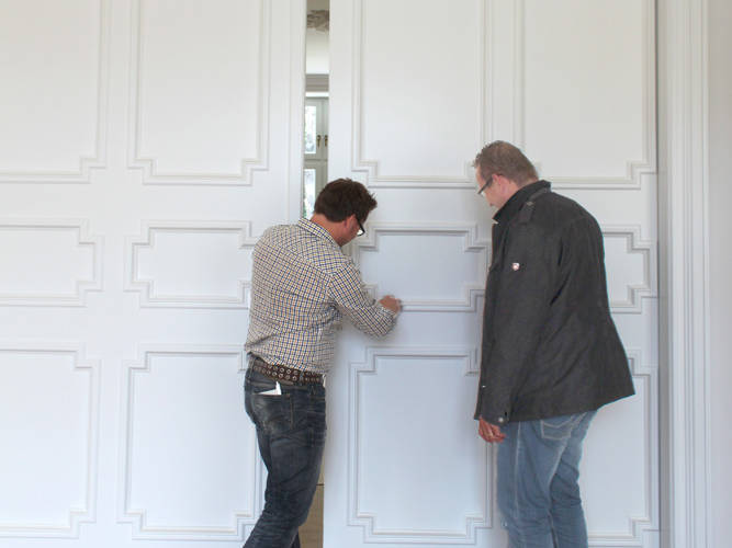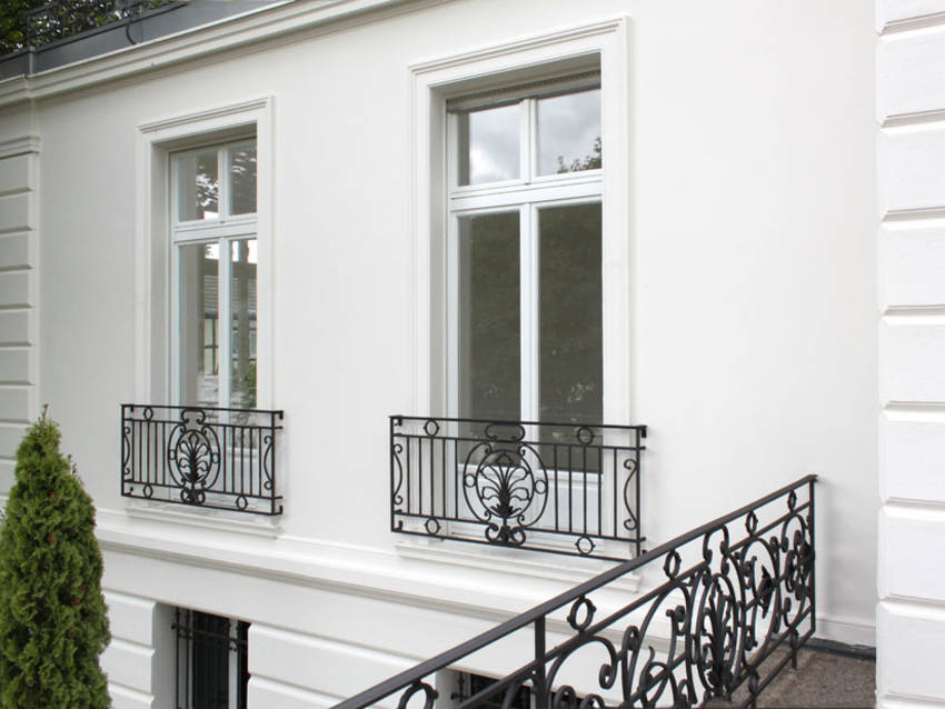 Zu den Highlights im Inneren der ehemaligen arabischen Botschaft gehören die fast raumhohen Fenster, die zur Rheinseite hin einen atemberaubenden Blick auf den Fluss und den sich darüber erhebenden Drachenfels eröffnen. Leider waren die Holzfensterrahmen durch Verschleiß und Witterungsbelastung in einem ziemlich bemitleidenswerten Zustand. Ähnliches galt für die aufwändig strukturierten historischen Kassettentüren. Hier war nicht nur der Lack im Lauf der Jahre stark abgeblättert; das Holz wies auch zahlreiche, zum Teil recht tiefe Risse auf.